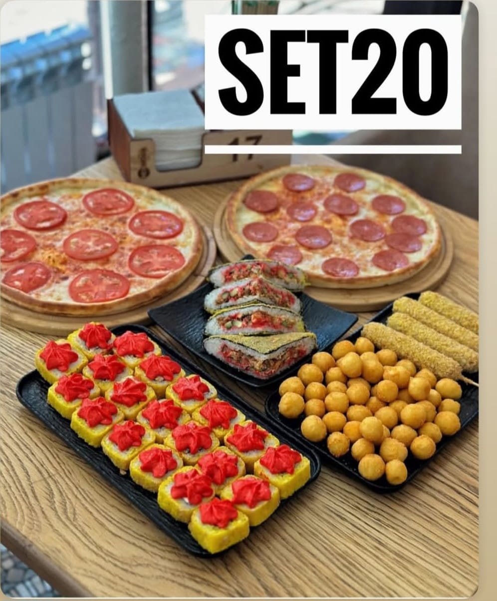 Сет № 20, Суши 20 шт, корндоги 4 шт, картофельные шарики, саше Пицца 2 шт