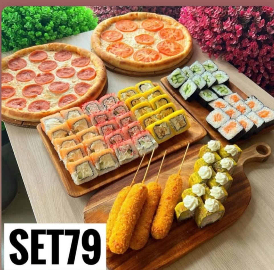 60 шт роллов и 2 пиццы и корндог